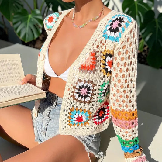 Handmade Crochet Granny Square Cardigan Colorful Boho Knit Sweater Vintage Retro Festival Top